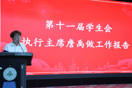 第十一届执行主席詹禹进行本届院学生会工作成果汇报,强调下阶段工作重点,对未来规划与发展方向做出工作展望。他提出,学生会当下应完善育人体系,对院内学风进行整顿、创新,并优化91网站